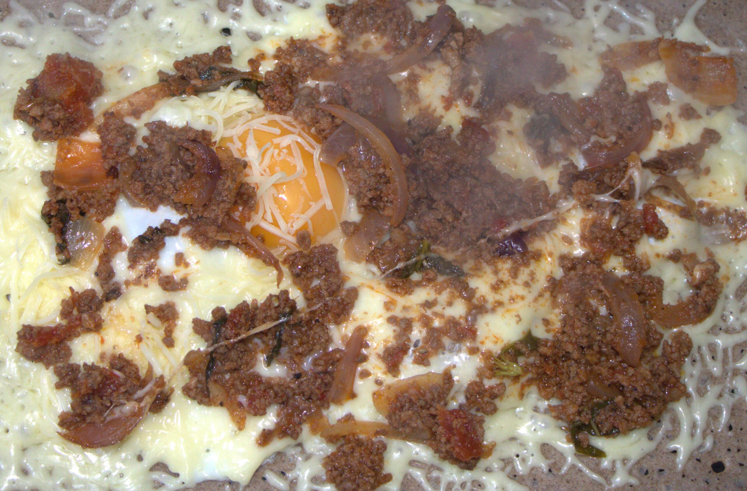 Viande hachée, oeuf plein air, emmental, confit de tomates, crème fraîche