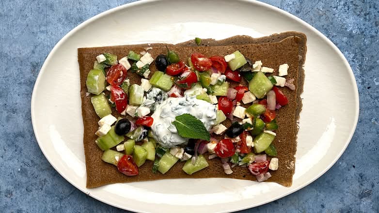 Cherry tomatoes, Feta, cucumber, black olives, red onions, green pepper, mint, olive oil, lemon, Greek yogurt sauce